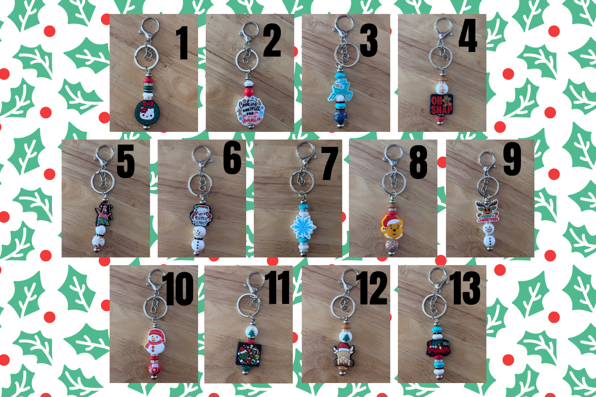 Add a pop of holiday cheer to your keys, bags, or stockings with these adorable Christmas-themed keychains! Each piece is handmade with festive charms and colorful beads, making them the perfect gift, stocking stuffer, or personal treat.